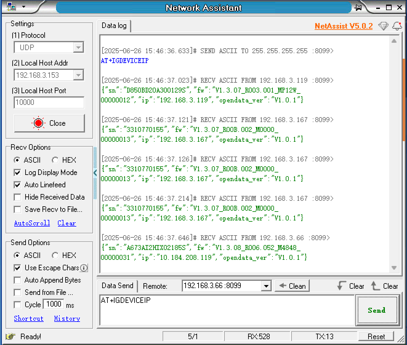 如果接收区无数据,请检查设备与电脑是否处于同一个局域网下,并确保防火墙允许该网络通信。